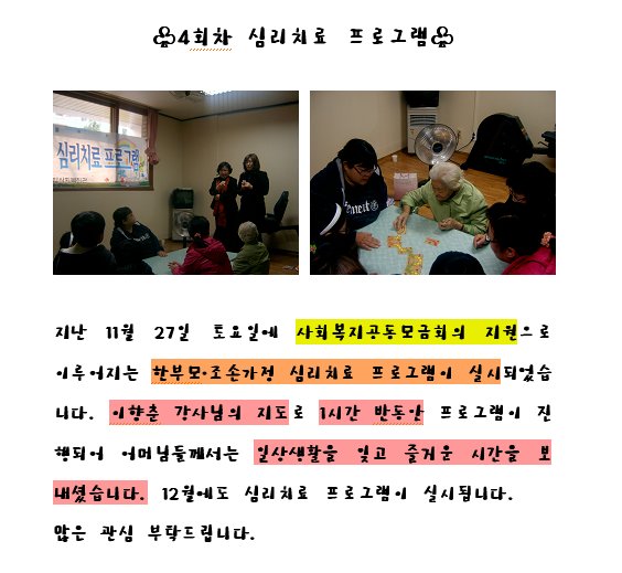 4회차 심리치료 프로그램이 진행되었습니다. 게시글 작성정보 작성자 금강종합사회복지관 작성일 10-11-29 10:53 조회수 1,704 댓글수 0 목록 게시글 본문 첨부파일 1개 d93e7948_Image0.jpg (57.0K) 0회 다운로드 첨부일시 : 2010-11-29 10:53:48 이전글 청춘삼박자 어르신들과 문화기행 다녀왔습니다^^ 10-12-01 다음글 4회차 멘토 사례회의가 진행되었습니다. 10-11-29 댓글 0 등록된 댓글이 없습니다. 목록