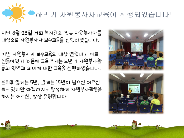 하반기 자원봉사자 보수교육이 진행되었습니다~ 게시글 작성정보 작성자 금강종합사회복지관 작성일 15-08-31 16:33 조회수 2,280 댓글수 0 목록 게시글 본문 첨부파일 1개 자원봉사자 보수교육.png (752.4K) 0회 다운로드 첨부일시 : 2015-08-31 16:33:03 이전글 8월 어르신 자원봉사단:향기로운 만남이 진행되었습니다^_^ 15-09-01 다음글 8월 가계금융역량강화프로그램이 진행되었습니다~ 15-08-31 댓글 0 등록된 댓글이 없습니다. 목록