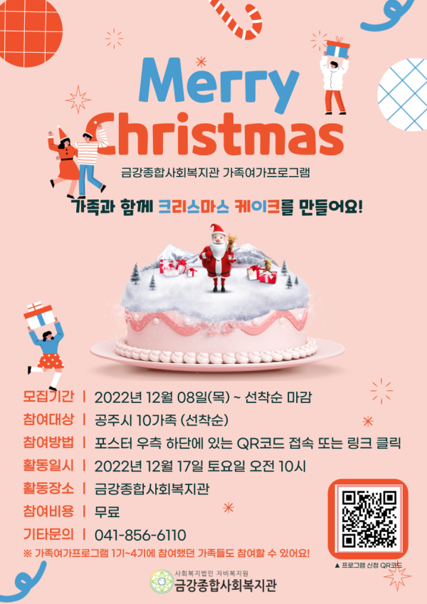 가족이 함께 크리스마스 케이크를 만드는 프로그램으로, 12월 17일 토요일 오전 10시에 금강종합사회복지관(옥룡동 내 위치)에서 진행됩니다.