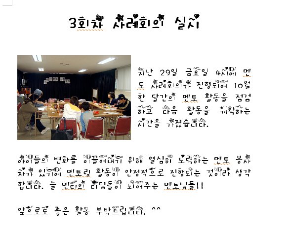 3회차 멘토 사례회의!! 게시글 작성정보 작성자 금강종합사회복지관 작성일 10-11-02 18:57 조회수 1,730 댓글수 0 목록 게시글 본문 첨부파일 1개 972fc29e_Image0.jpg (54.3K) 0회 다운로드 첨부일시 : 2010-11-02 18:57:14 이전글 한부모*조손가정 심리치료 프로그램- 10-11-02 다음글 멘토*멘티 집단활동이 있었습니다. 10-11-02 댓글 0 등록된 댓글이 없습니다. 목록